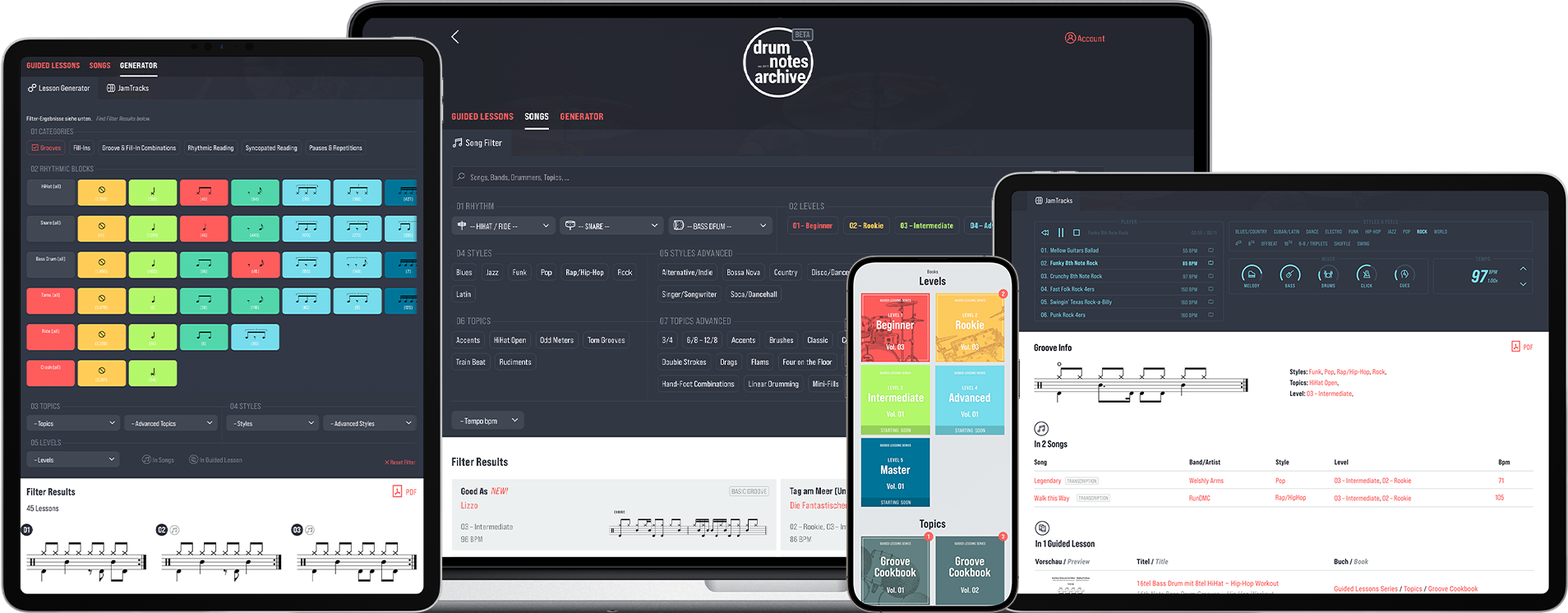 Deine Suchmaschine für Lessons, Songs, Grooves & Fills.